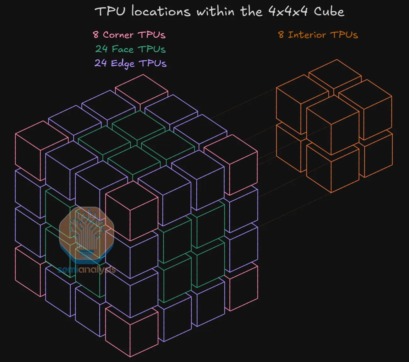 4x4x4 立方体内部的 TPU 将仅通过 DAC 连接到其他 4 个相邻 TPU,立方体表面的 TPU 将通过 3 个 DAC 和 1 个光收发器进行连接,立方体边缘的 TPU 将通过 2 个光收发器和 2 个DAC进行连接,而立方体角落的TPU将通过 1 个DAC和 3 个光收发器进行连接。要记住某个 TPU 将使用多少个收发器,只需看该 TPU 有多少个面朝向立方体的“外部”即可。